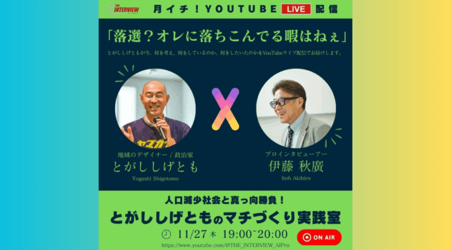 とがししげとものマチづくり実践室、月イチYouTube LIVE配信決定! この企画はプロインタビュアー #伊藤秋廣 さん(AIプロダクション代表)をお迎えし、 毎月1回、YouTube LIVEで生配信していきます! […]